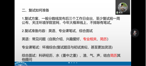本次讲座分为两个部分,第一个部分是由考入华中科技大学的17级毕业生文明烜、考入中国地质大学(武汉)的17级毕业生郭庆、考入重庆大学的17级毕业生常一琳分享复试经验,包括一志愿复试与调剂复试两方面,第二个部分由同学们自由提问。