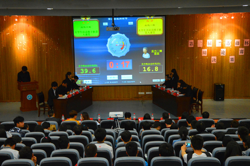 经过前期初赛、复赛和半决赛的激烈角逐,来自2015应用化学1班和2015应用化学6班代表队挺进决赛。辩论双方以 “大学生应不应该将手机带入课堂”为题展开辩论。辩手们经过开篇立论、双方攻辩、自由辩论、总结陈词等各个环节双方引经据典、旁征博引,不时引发现场观众热烈的掌声。最后,2015应用化学1班代表队夺得冠军