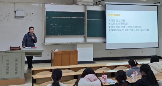 张光宇向同学们传达了学校关于研究生寒假留校期间安全管理要求,分别从宿舍安全、人身安全、留校及返校注意事项等作出强调。一是留校同学要遵守校规校纪,假期期间严格遵守宿舍管理规定,注意用电安全。二是完成科研任务后,务必在离校前将个人去向及离校具体时间告知辅导员和导师,保持通讯畅通。三是加强“朋辈互助意识”,充分发挥学生自我教育主体性,确保同学们留校期间学习生活平稳安全。