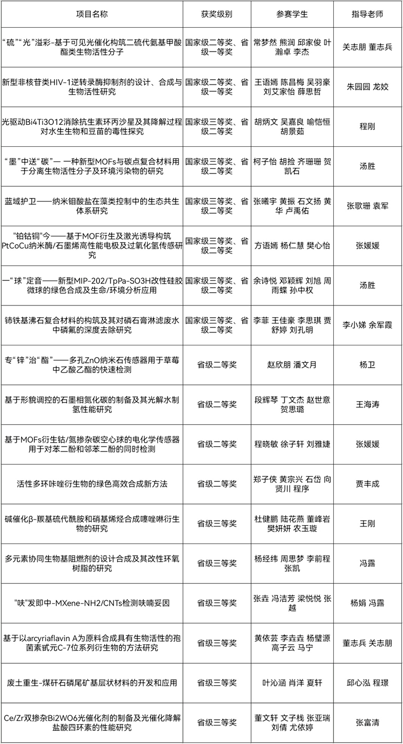 师生再次在该项高水平全国性赛事中表现优异,斩获国家级二等奖2项、国家级三等奖6项、省级二等奖4项、省级三等奖6项,共计18项荣誉! 获奖学生覆盖2021级至2023级应用化学、环境工程专业本科生。