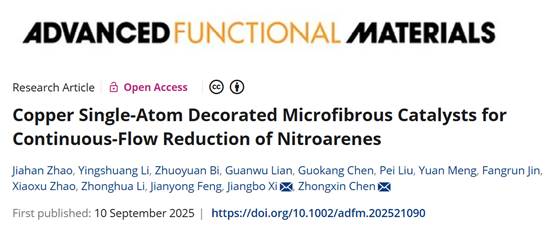 Jiahan Zhao, Yingshuang Li, Zhuoyuan Bi, Guanwu Lian, Guokang Chen, Pei Liu, Yuan Meng, Fangrun Jin, Xiaoxu Zhao, Zhonghua Li, Jianyong Feng, Jiangbo Xi*, Zhongxin Chen*, Copper Single-Atom Decorated Microfibrous Catalysts for Continuous-Flow Reduction of Nitroarenes. Adv. Funct. Mater. 2025, e21090. //doi.org/10.1002/adfm.202521090