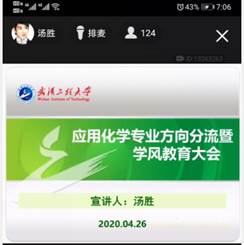 (通讯员 殷正霞)为保障疫情期间2018级应用化学、环境工程两个专业的方向分流工作顺利进行,学院通过线上组织召开了方向分流宣讲会。4月26日,学院分党委书记郭昕、院长余军霞、副院长王营茹、应用化学教研室主任高洪、专业负责人陈嵘教授、环境工程与环境监察教研室主任关洪亮、副主任张华丽、2018级辅导员杨娟以及全体专业课教师和2018级全体同学参加了此次宣讲会。