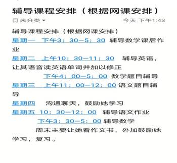 辅导过程中,她会定期向我汇报课程安排,作业布置,我也会让她阅读课外书,检查英语单词等。