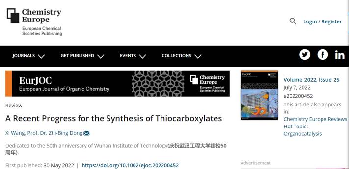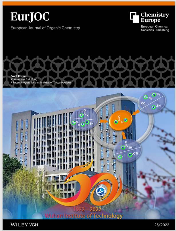 董志兵教授课题组在著名有机化学期刊European Journal of OrganicChemistry发表了题为“A Recent Progress for the Synthesis ofThiocarboxylates”(DOI: doi.org/10.1002/ejoc.202200452)的封面论文(第一作者:王曦,通讯作者:董志兵)。该期封面以学校大化工楼和学校50年校庆LOGO为背景,对近期硫酯类化合物的合成方法和应用进展进行了全面介绍,同时,该论文也是对该课题组近期在有机硫化学领域的思考和总结。该论文利用国际著名学术期刊为平台,积极推介我校,为我校50年校庆营造了良好的学术氛围,对提升我校的综合影响力和社会美誉度都有积极的意义。