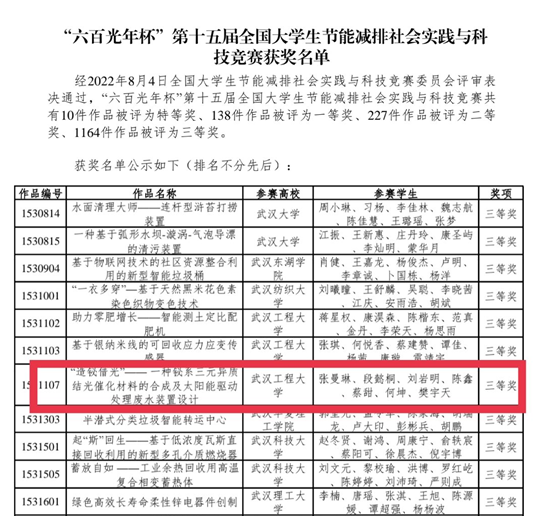 推送的参赛作品《“造铋借光”——一种铋系三元异质结光催化材料的合成及太阳能驱动处理废水装置设计》,在柯军、张哲两位老师的共同指导下,由2018级环境工程专业张曼琳负责,在刘岩明,段懿桐,陈鑫,蔡甜,何坤,樊宇天等同学的共同努力下,荣获国家三等奖。