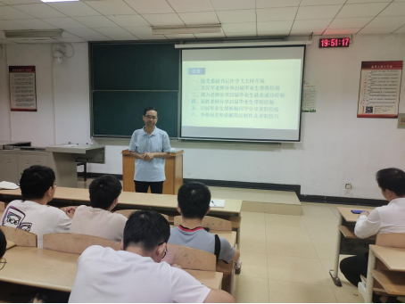 2018级环境工程01班的班主任,该班在郭老师的带领下,荣获过全校“优良学风班”荣誉称号,全班29名同学考研过线率79.3%,考研录取率65.5%,被985、211、双一流高校录取率达到41.4%。他有着深厚的学生情怀、丰富的带班经验、细腻的工作方法,他向同学们分享了2022届优秀毕业生的故事,通过有趣但不失哲理的真实故事向同学们阐释了职场的逻辑和真理。他表示,通过在职场中接触人和事、提升专业技能远比一时的薪资更为重要,自我认知、扩充人脉、搭建桥梁才能得到更多机遇。