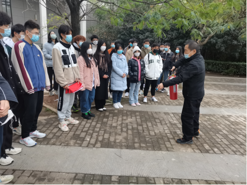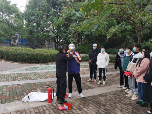 此次消防演习的主要内容是向学生宣传消防知识,现场教学生学习灭火器、灭火毯和阻燃头套的使用。演习开始前,王子龙老师向大家讲解了灭火器的种类和构造,并亲自演示了灭火器、灭火毯和阻燃头套的正确操作步骤和使用方法。