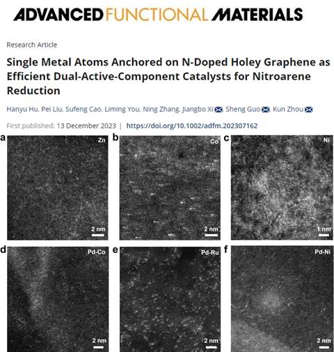 设计和制备负载型金属基催化剂时,通常是将活性金属负载于具有特殊形貌的载体上。科研人员主要关注金属的催化活性贡献,鲜有探讨催化剂载体对催化过程的直接贡献。奚江波教授课题组提出将整合金属单原子与活性载体的策略,成功制备了一系列双活性组分催化剂(DACC)。通过在氮掺杂多孔石墨烯(NHG)上锚定单原子(如Pd1、Ni1、Co1和Zn1)或双单原子(如Pd1-Co1、Pd1-Ru1和Pd1-Ni1)得到一系列DACC。实验和理论计算研究证明Pd1/NHG DACC由高度分散的金属原子物种和活性NHG载体,得益于金属单原子和碳基催化剂NHG的协同增强作用,Pd1/NHG DACC在一系列硝基芳烃的还原反应中表现出优异的催化性能,对于典型芳硝基化合物(如,4-硝基苯酚)的催化还原活性可达商业Pt/C (5.0 wt.%)的97倍,且对Suzuki-Miyaura反应亦展现出优良的催化活性。本研究对于高性能DACC催化剂的设计和制备提供了有益参考。研究结果以题为《Single metal atoms anchored on N-doped holey graphene as efficient dual-active-component catalysts for nitroarene reduction》的论文发表在国际知名期刊Advanced Functional materials上(影响因子19.0)。