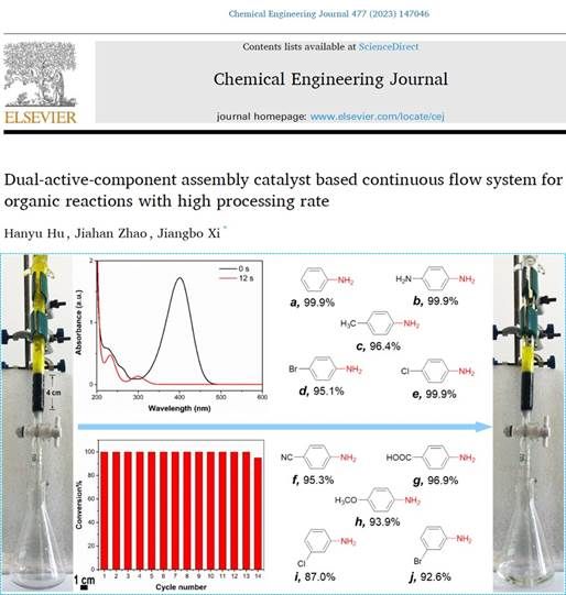 为了进一步推进单原子催化剂的工业应用,奚江波教授课题组创新性地将单原子催化剂与连续流催化系统结合起来,设计了具有高活性和低流动阻力的填充催化剂,为连续流催化系统的构筑提供了有益技术参考。在这项研究中,构筑了一种新型的负载单原子金属的组装体型催化剂,将NHG负载Pd单原子组装在硅酸铝纤维(FASC)基底上,得到双活性组分组装体催化剂(DACAC)。具有多级多孔结构和一定机械性能的Pd1/NHG–FASC DACAC可便捷地集成于柱管反应器中构建固定床催化系统,进而实现连续流催化反应。基于Pd1/NHG–FASC DACAC的固定床催化系统在硝基芳烃还原和苯基硼酸氧化羟基化反应皆展现出优异的催化性能。本研究的双活性组分的活性增强策略为高效催化填料的制备提供了新的设计思路。该研究成果以题为《Dual-active-component assembly catalyst based continuous flow system for organic reactions with high processing rate》的论文发表在工程技术与化学化工领域高影响力期刊Chemical Engineering Journal(影响因子15.1上)。