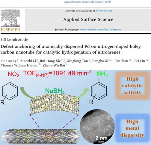 此外,针对单原子催化剂电子结构的优化以及稳定性等问题,奚江波教授课题组采取缺陷诱导原子级分散金属催化剂的合成方法,促使高度分散的Pd团簇和单原子稳定锚定于氮掺杂多孔碳纳米管(NHCN)上。制备的Pd/NHCNT催化剂对硝基芳烃的催化加氢中展现出优异活性该研究成果以题为《Defect anchoring of atomically dispersed Pd on nitrogen-doped holey carbon nanotube for catalytic hydrogenation of nitroarenes》的论文发表在国际著名期刊Applied Surface Science上。该期刊为材料科学Top期刊(影响因子6.7)。