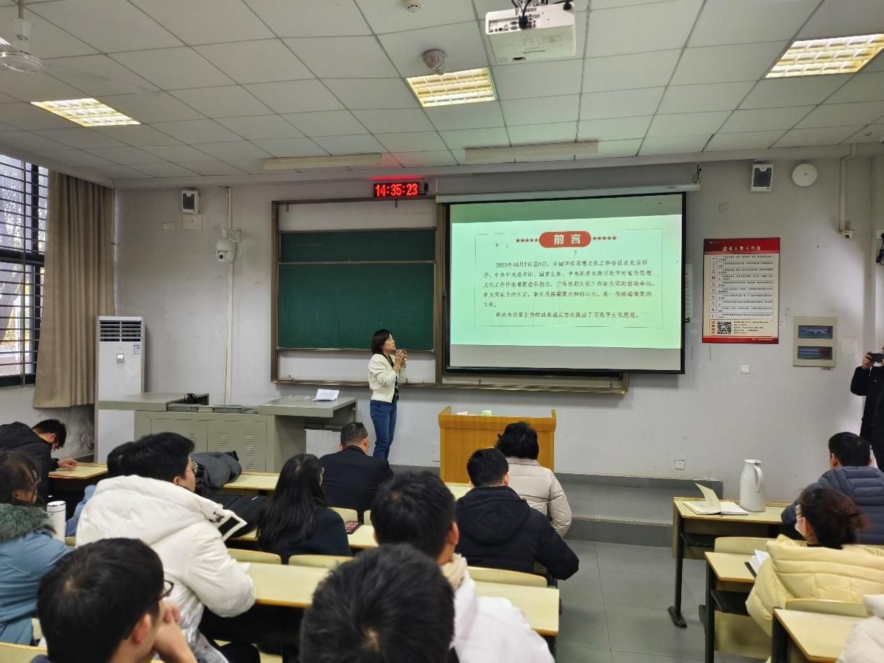 思政导师、校马克思主义学院教师韩雪吟开展“深入学习贯彻习近平文化思想”专题讲座。学院党委委员、新一届党支部委员会委员、党员代表、党外人士代表、学生代表参会。会议由学院党委书记张宗良主持。