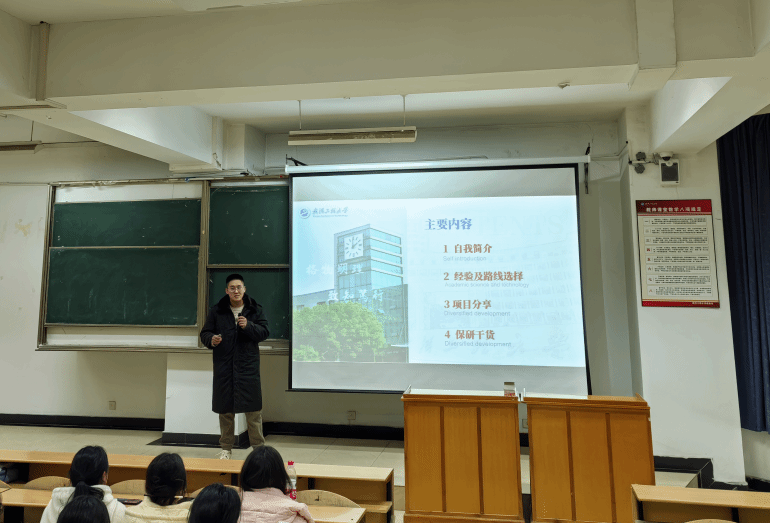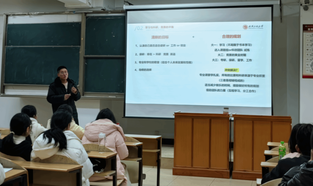康淏森以成长经验为主题,主要从竞赛经验及路线选择,具体项目分享,保研考研干货三个方面详细分享了他大学几年的成长体会和感悟。他首先谈及大学科研竞赛对于解决实际问题能力的重要支撑作用,对于将来进一步深造和就业都是很好的简历加分项;接着对高校榜单目录内的84项比赛进行了分类阐述,指出同学们要根据自己的情况有选择的重点参加;然后谈及他从大一开始就自发主动进入科研实验室,本着对指导老师和自己高度负责地态度,充分发挥主观能动性,及时高效地完成科研工作并发表论文专利成果,并以取得的成果积极参加各类适合的赛事,同时以队长身份建设好本科生团队和做好团队外联工作;最后他还重点对保研过程中的信息、成绩、竞赛论文等要素进行精彩的拓展。在讲座的过程中,康淏森时常提及同学们要尽早树立个人目标,无论是考研,就业还是考公,告诫大家大学就是进入社会前的演习,要做好规划,用好自己的宝贵时间,努力提高自己的个人能力。在交流互动环节,就同学们关心的“互联网+和小挑的侧重点?”“保研面试的流程及重点考察内容?”“如何平衡学业成绩和课外科研?”等多个问题进行了认真仔细的回答。