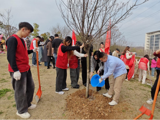 2025年植树节主题活动在流芳校区凤鸣坡举行。本次活动以“植此青绿筑工大 携手同心创未来”为主题,校党委书记汪伟、党委副书记李志旭、校纪委书记方文海、副校长马小龙及相关职能部门领导出席,各学院师生代表共同参与。学院党委副书记许守飞、全体辅导员及学生志愿者代表热情投身其中,以实际行动践行绿色发展理念,为美丽校园建设贡献力量。