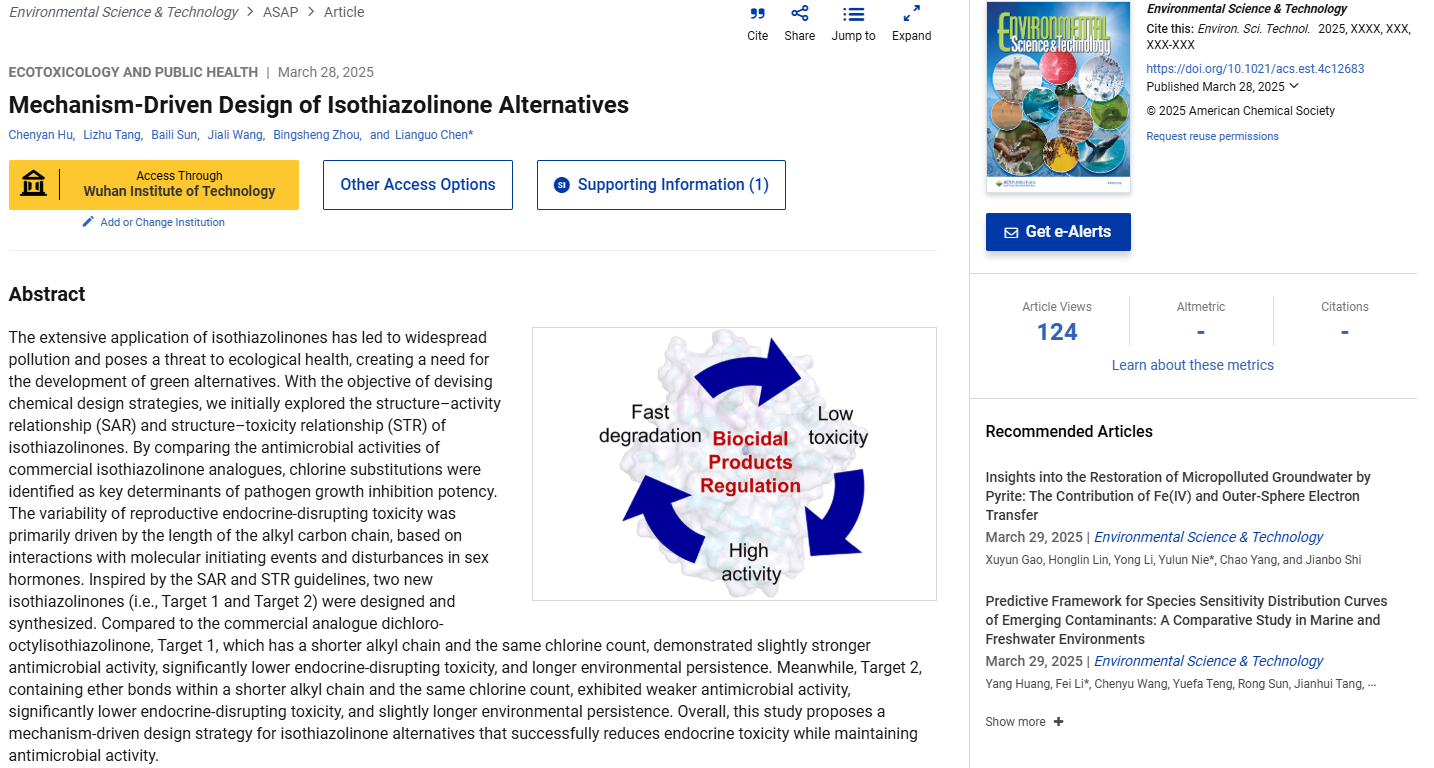 cos成人 教师胡陈艳在Environmental Science & Technology期刊上发表论文 作者:发布时间:2025-04-17点击率: (通讯员 胡陈艳)2025年3月28日环境科学与工程领域顶级期刊Environmental Science & Technology(ES&T)在线发表cos成人 胡陈艳老师为第一作者(cos成人 为第一单位)的研究论文“Mechanism-Driven Design of Isothiazolinone Alternatives”。异噻唑啉酮是一类高效广谱抗菌剂,广泛应用于护理产品、家庭用品和建筑船舶涂层。然而,其生产使用已造成广泛环境污染,干扰生殖内分泌功能,严重威胁生态健康,成为亟需关注和治理的新污染物。因此,开发高效低毒的绿色替代品迫在眉睫。本研究选取6种代表性异噻唑啉酮类似物,系统评估和比较其抗菌活性、胚胎急性毒性、Gαi靶蛋白亲和能力、以及内分泌干扰毒性,明确了决定抗菌活性与内分泌干扰毒性的关键结构元件。基于结构-活性关系(SAR)与结构-毒性关系(STR),采用机制驱动的设计策略,提出异噻唑啉酮替代品的合成路线:(1)保留氯取代和异噻唑啉酮环以保持有效的抗菌活性;(2)去除芳香环以避免引入内分泌干扰毒性;(3)缩短烷基碳链或引入醚键以降低疏水性和内分泌干扰毒性,成功合成两种新型异噻唑啉酮替代品(Target 1、Target 2),并对其抗菌活性、内分泌干扰毒性及环境降解动力学进行了全面评估。与具有C8烷基链和两个氯原子的商业化DCOIT相比,Target 1(C4烷基链、两个氯原子)展现出略高的抗菌活性、显著更低的雌激素毒性、以及更慢的降解速率;而Target 2(含有醚键的较短烷基链、两个氯原子)则表现出较弱的抗菌活性、显著更低的雌激素毒性,并且降解速度略慢。考虑到在保持抗菌性能的同时降低生态风险的综合需求,Target 1和Target 2均展现出作为各类产品中新型防腐剂的应用潜力。综上所述,本研究基于异噻唑啉酮的SAR和STR,采用机制驱动的设计策略,成功获得两种生态友好的新型异噻唑啉酮替代品,这一成果不仅可有效满足工业生产需求,还为未来绿色低毒化学品的设计提供了新的思路。ES&T杂志是美国化学学会的旗舰期刊,为中科院环境大类一区和JCR一区期刊,当前影响因子为10.9。这一研究主要由胡陈艳老师与中国科学院水生生物研究所陈联国研究员(论文通讯作者)合作完成,链接为://pubs.acs.org/doi/10.1021/acs.est.4c12683。 (审稿 张华丽)