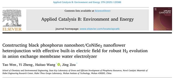 “催化与固废协同创新团队”在催化和能源领域国际权威期刊《Applied Catalysis B: Environment and Energy》(影响因子:20.3,中科院一区TOP,DOI:10.1016/j.apcatb.2025.125588)在线发表了题为“Constructing black phosphorus nanosheet/CoNiSe2 nanoflower heterojunction with effective built-in electric field for robust H2 evolution in anion exchange membrane water electrolyzer”研究论文。cos成人