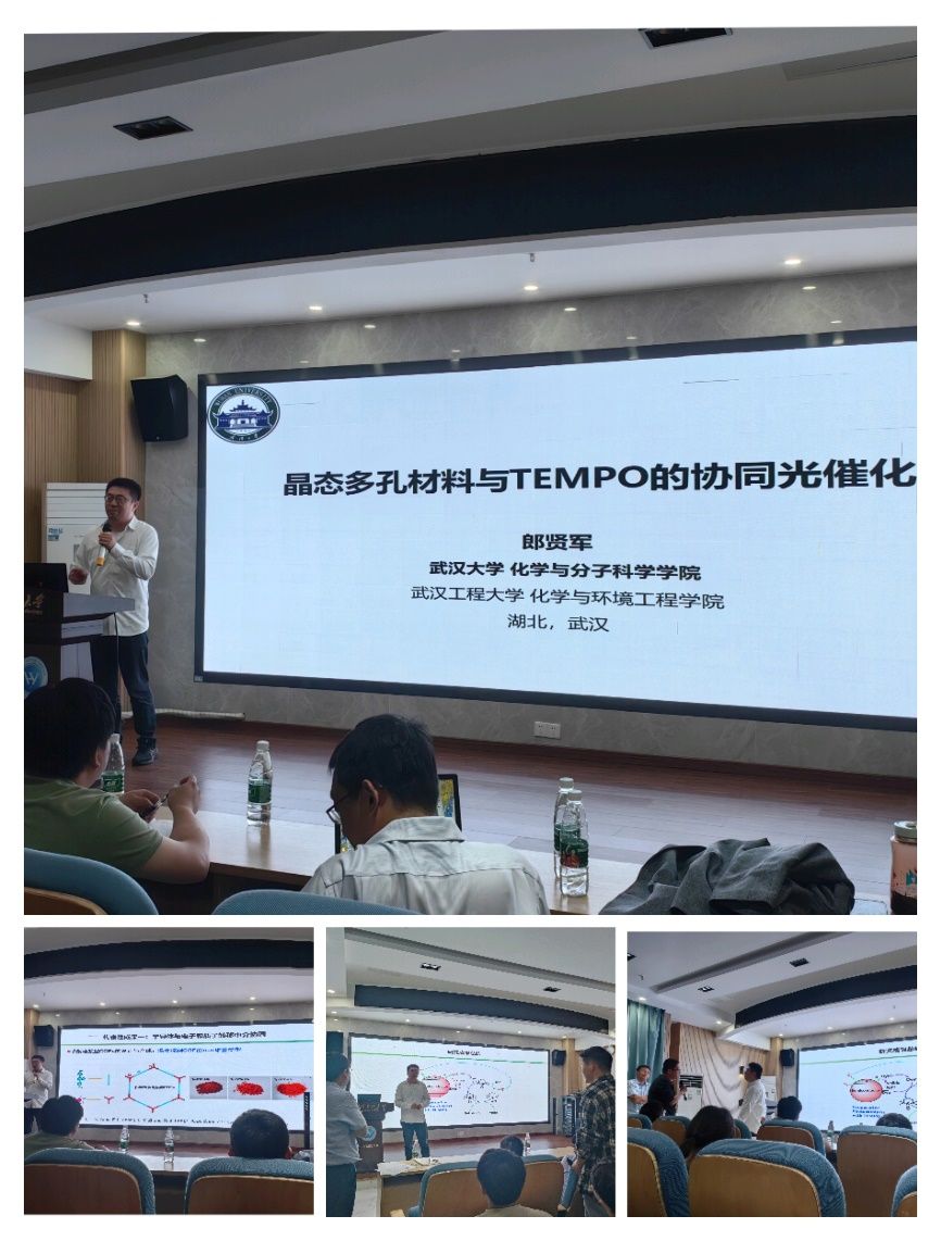 郎贤军研究员以《晶态多孔材料与TEMPO的协同光催化》为题,详细介绍了以共价有机框架为反应平台,成功实现了可见光光催化O2的活化用于有机小分子污染物的选择性氧化反应;同时提出了协同光催化的概念,将COFs可见光光催化与TEMPO(2,2,6,6-四甲基哌啶-氮-氧化物)催化相协同,实现了胺和硫醚类化合物的高选择性转化。同时报告还重点介绍了“半导体与电子和质子转移中介协同”、“半导体与电子转移中介协同”两个代表性成果,这些研究为我们在光催化中实现活性氧物种的调控,合成具有重要价值的有机化合物奠定了基础。最后,郎研究员鼓励同学们在进行科研时要多探索、多思考,保持对科研的热情。